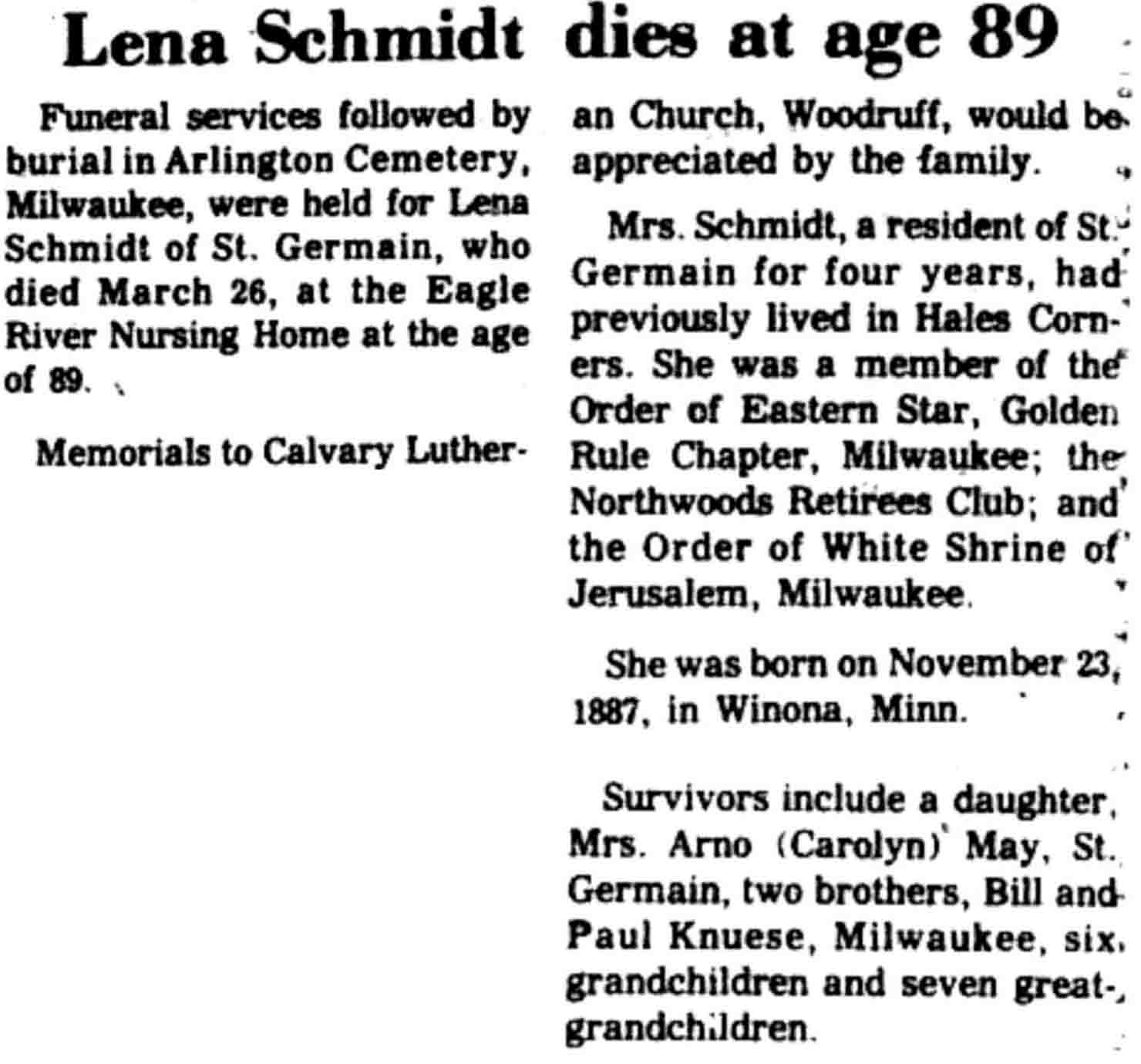| Schmidt | Lena (Knuese) | 23 Nov 1887 | 26 Mar 1977 | VCN | 31 Mar 1977 | 18 |