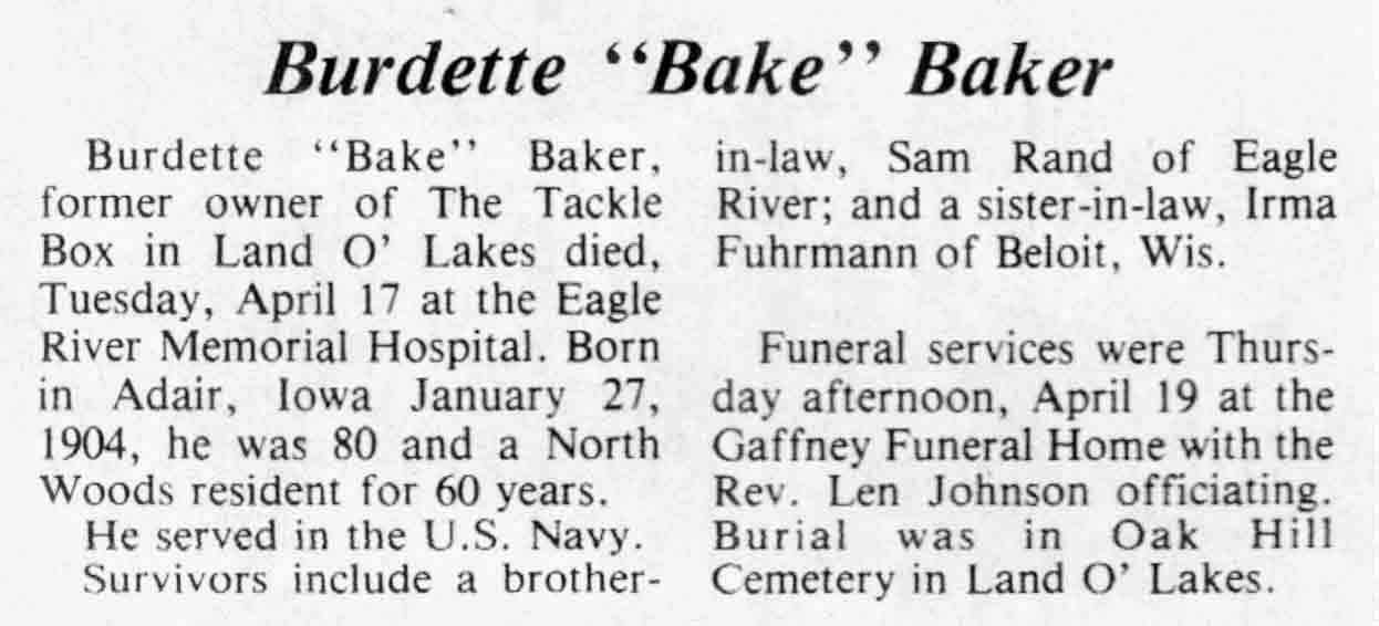 | Baker | Burdette 'Bake' | 27 Jan 1904 | 17 Apr 1984 | TLN | 25 Apr 1984 | 4 |
