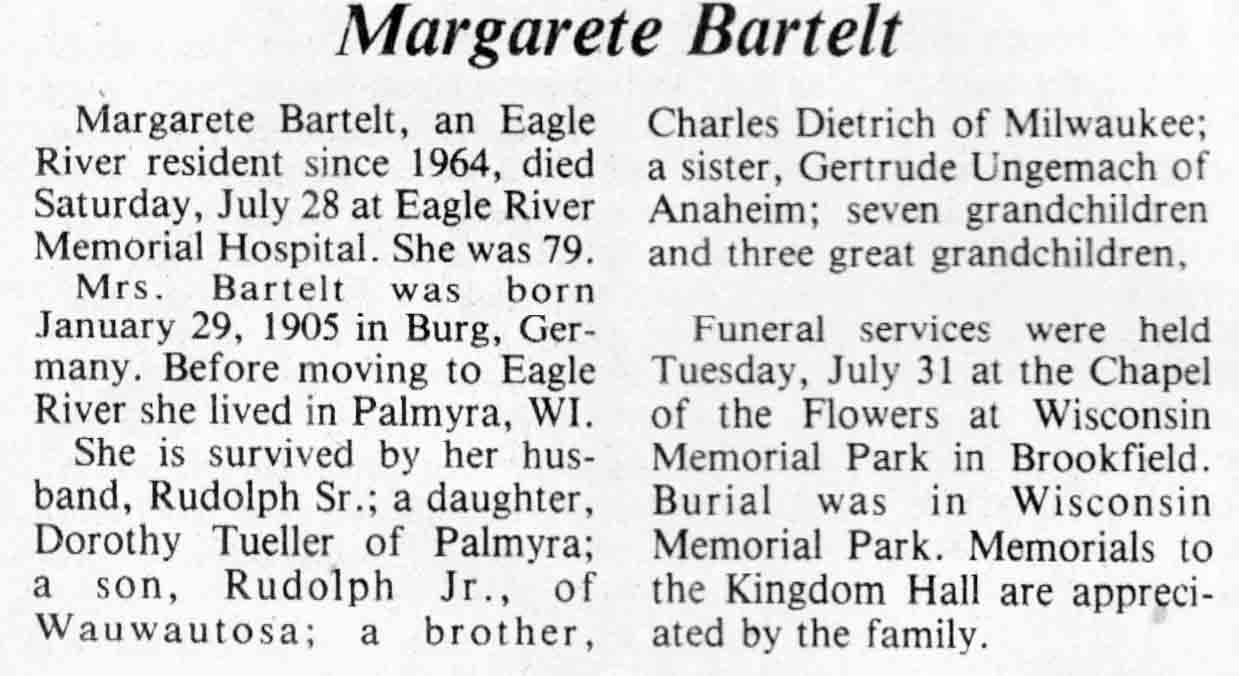 | Bartelt | Margarete (Dietrich) | 29 Jan 1905 | 28 Jul 1984 | TLN | 01 Aug 1984 | 4 |