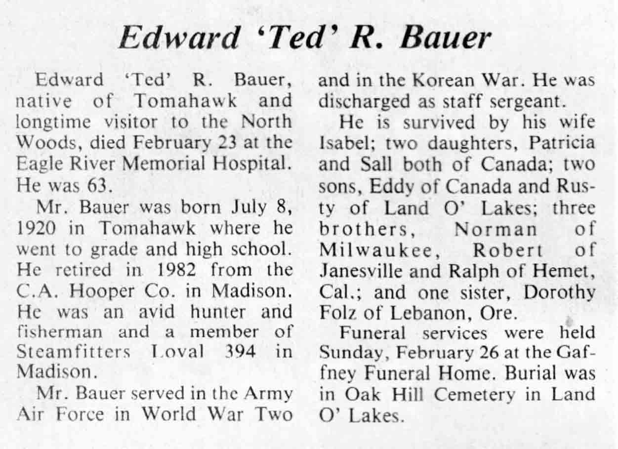 | Bauer | Edward R 'Ted' | 08 Jul 1920 | 23 Feb 1984 | TLN | 29 Feb 1984 | 4 |