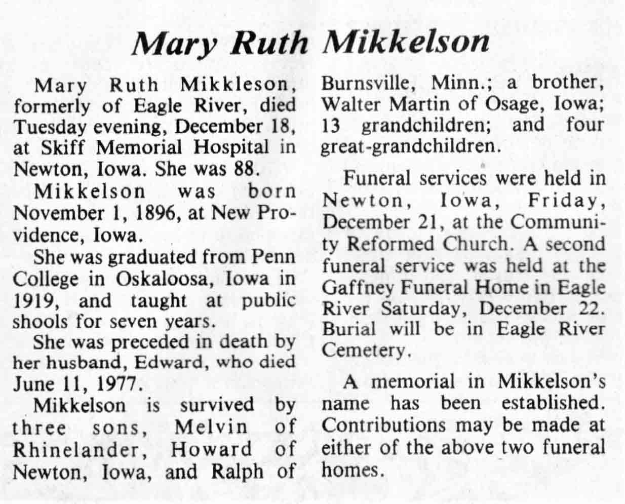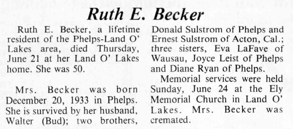 | Becker | Ruth E (Sulstrom) | 20 Dec 1933 | 21 Jun 1984 | TLN | 27 Jun 1984 | 4 |
