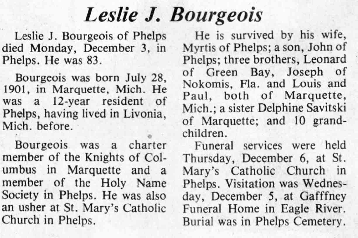 | Bourgeois | Leslie J | 28 Jul 1901 | 03 Dec 1984 | TLN | 12 Dec 1984 | 4 |