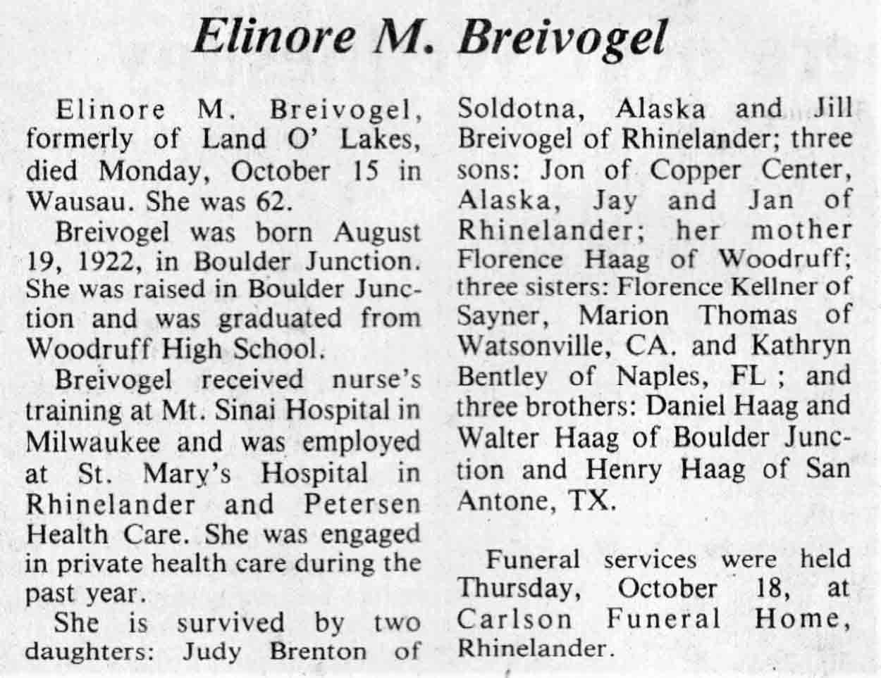 | Breivogel | Elinore M (Haag) | 19 Aug 1922 | 15 Oct 1984 | TLN | 24 Oct 1984 | 4 |