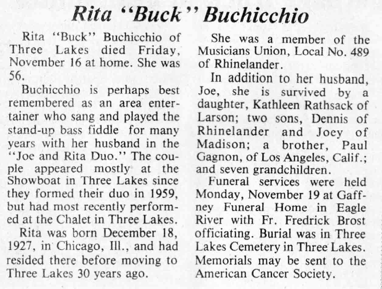 | Buchicchio | Rita 'Buck' (Gagnon) | 18 Dec 1927 | 16 Nov 1984 | TLN | 21 Nov 1984 | 4 |