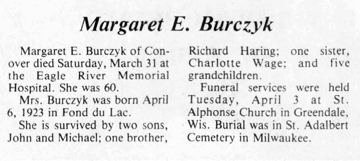 | Burczyk | Margaret E (Haring) | 06 Apr 1923 | 31 Mar 1984 | TLN | 04 Apr 1984 | 4 |