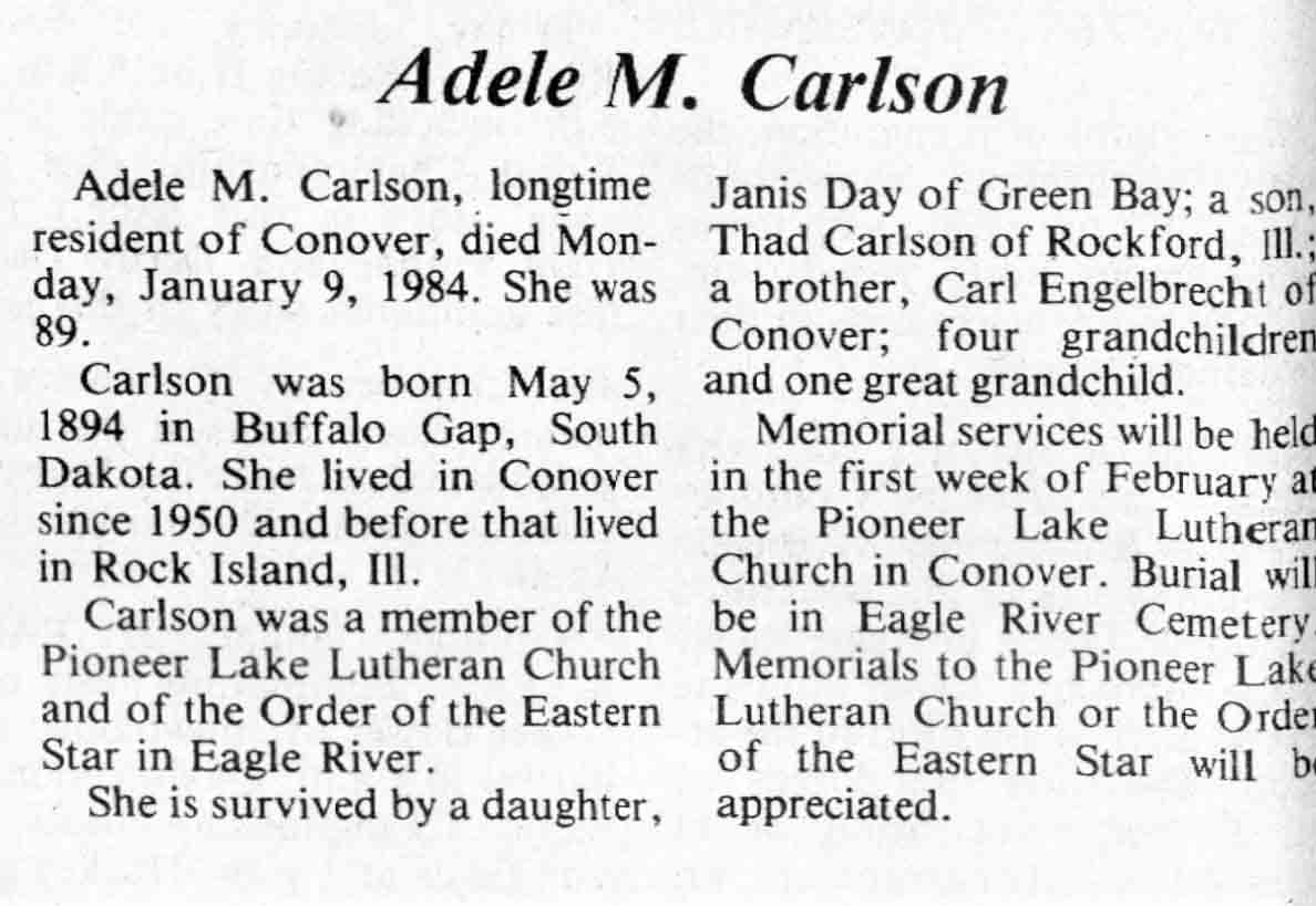 | Carlson | Adele M (Engelbrecht) | 5 May 1894 | 09 Jan 1984 | TLN | 18 Jan 1984 | 6 |