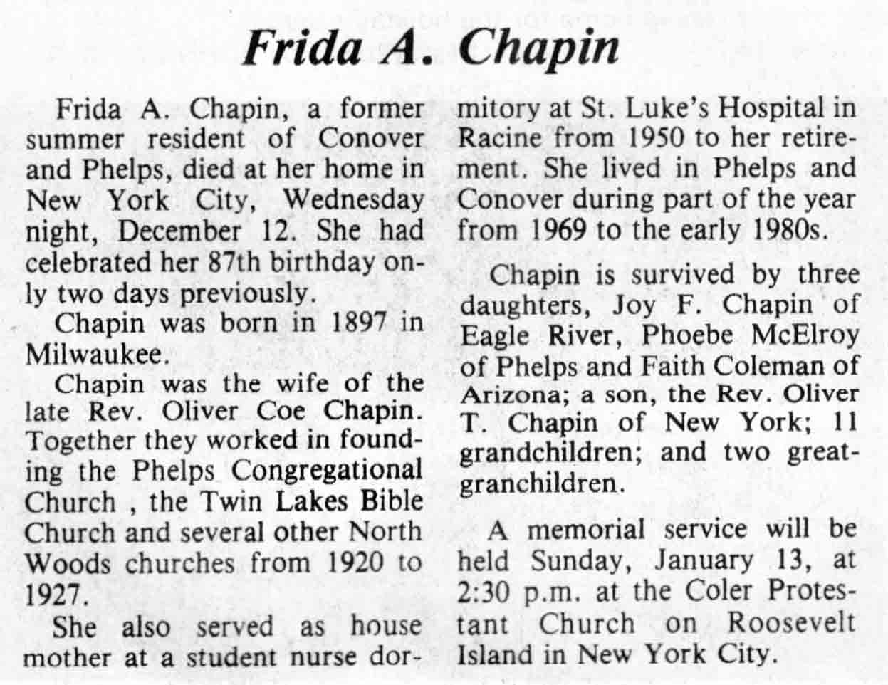 | Chapin | Frida A | 10 Dec 1983 | 12 Dec 1984 | TLN | 26 Dec 1984 | 4 |