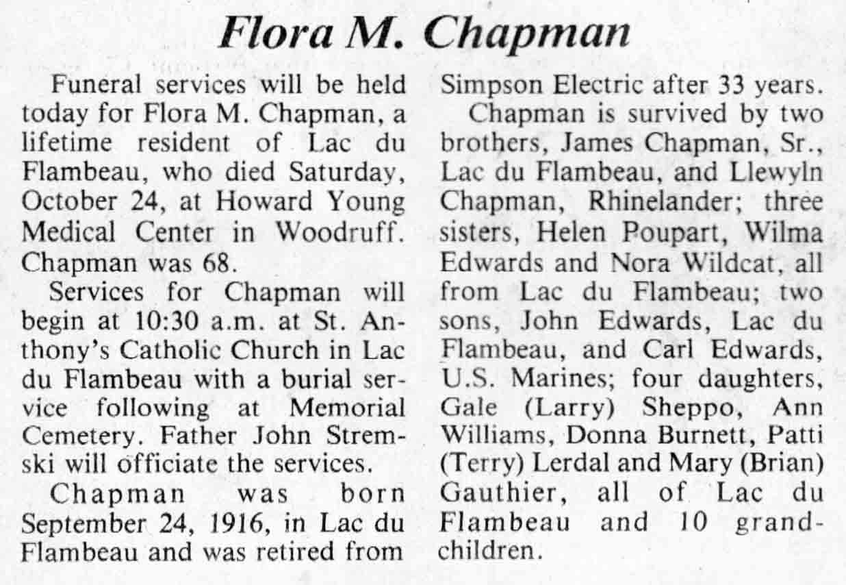 | Chapman | Flora M | 24 Sep 1916 | 24 Oct 1984 | TLN | 24 Oct 1984 | 4 |