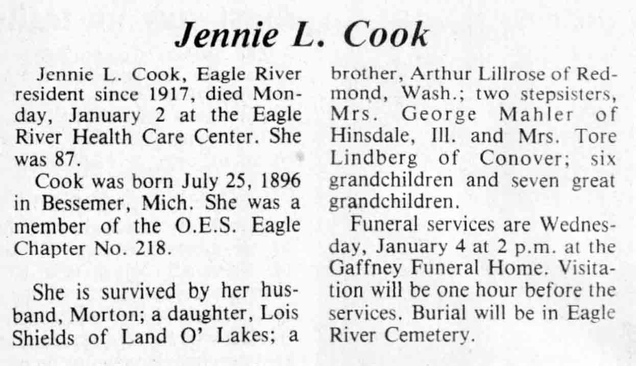 | Cook | Jennie L | 25 Jul 1896 | 02 Jan 1984 | TLN | 04 Jan 1984 | 4 |