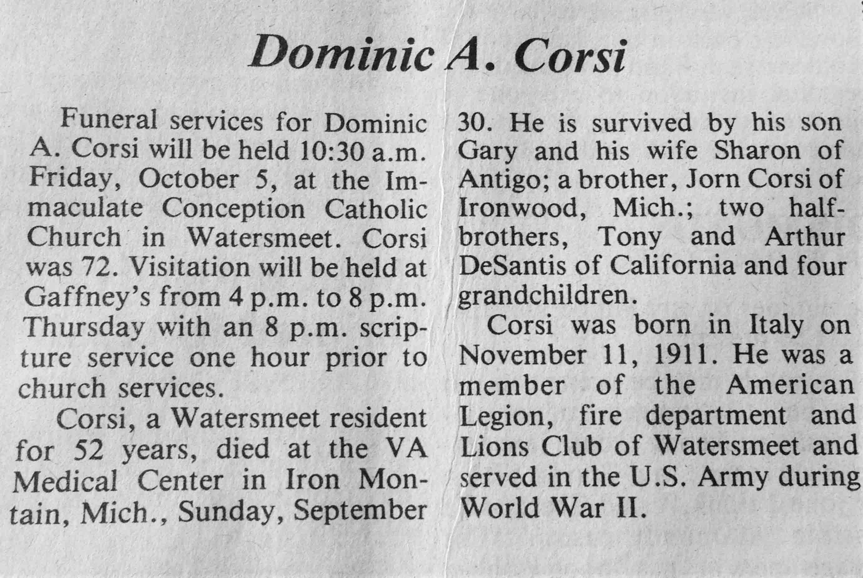 | Corsi | Dominic A | 11 Nov 1911 | 30 Sep 1984 | TLN | 03 Oct 1984 | 4 |