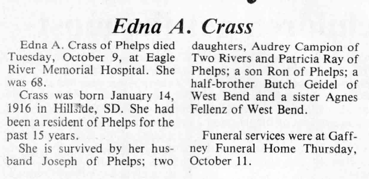 | Crass | Edna A | 14 Jan 1916 | 09 Oct 1984 | TLN | 17 Oct 1984 | 4 |