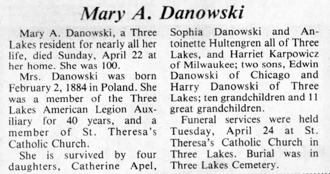| Danowski | Mary A | 2 Feb 1884 | 22 Apr 1984 | TLN | 25 Apr 1984 | 4 |