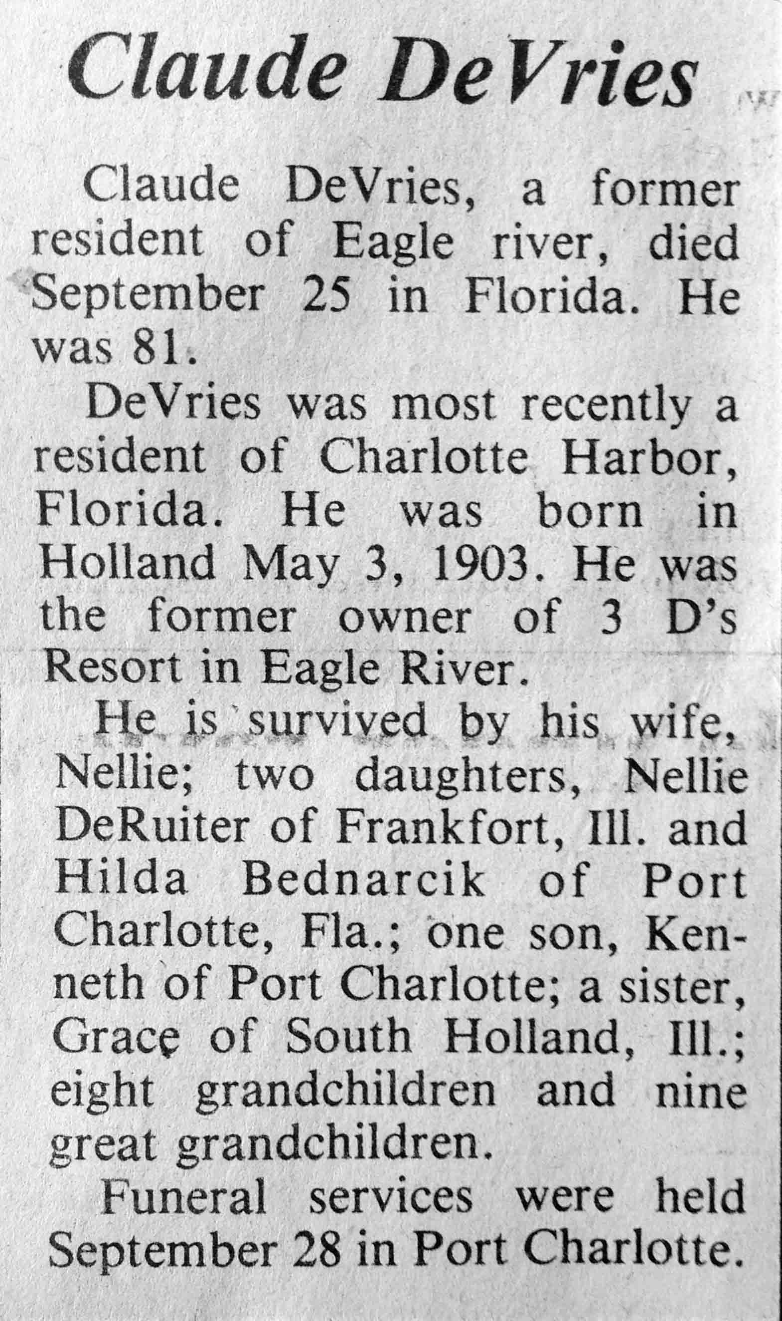 | DeVries | Claude | 03 May 1903 | 25 Sep 1984 | TLN | 03 Oct 1984 | 4 |