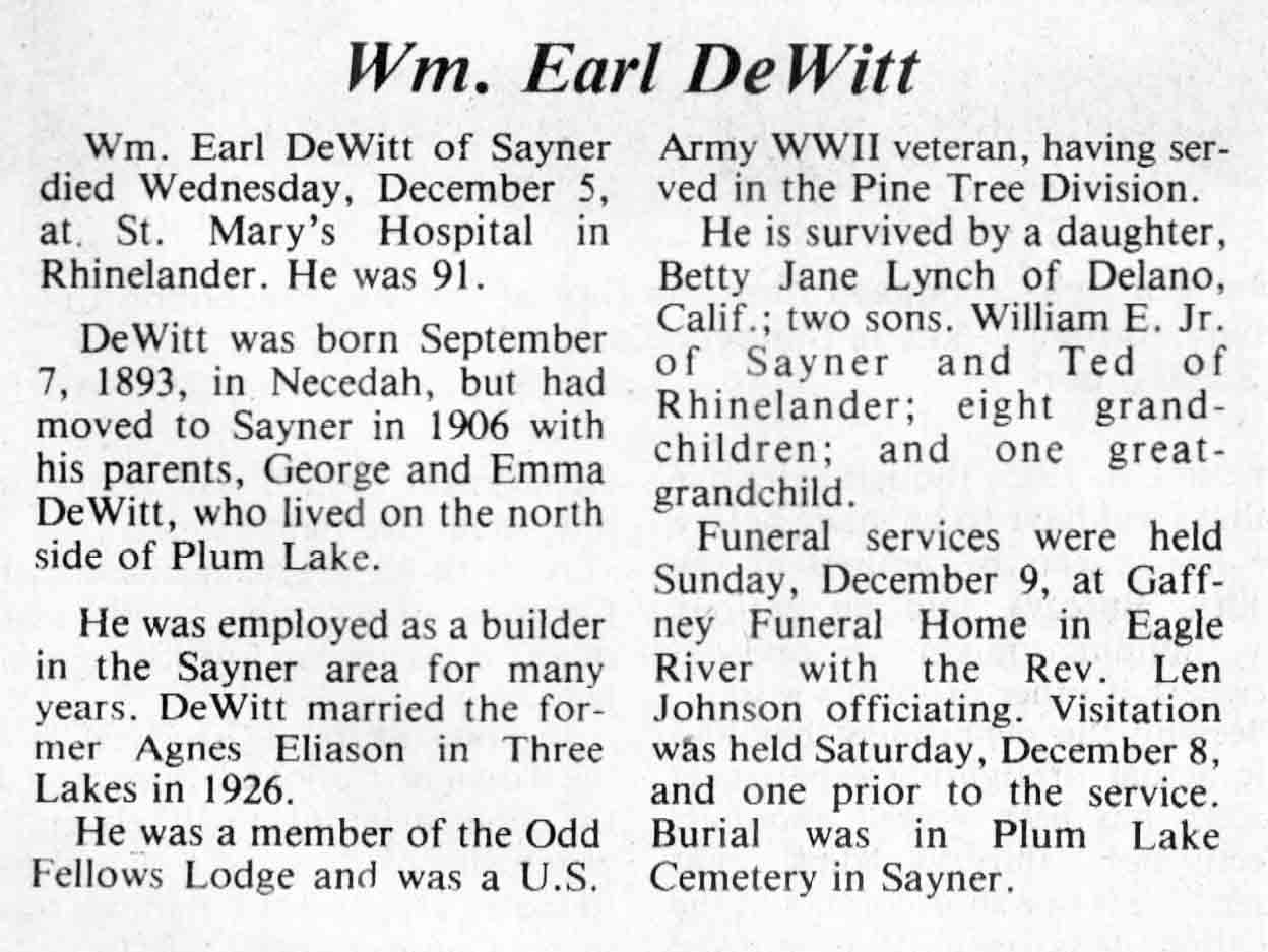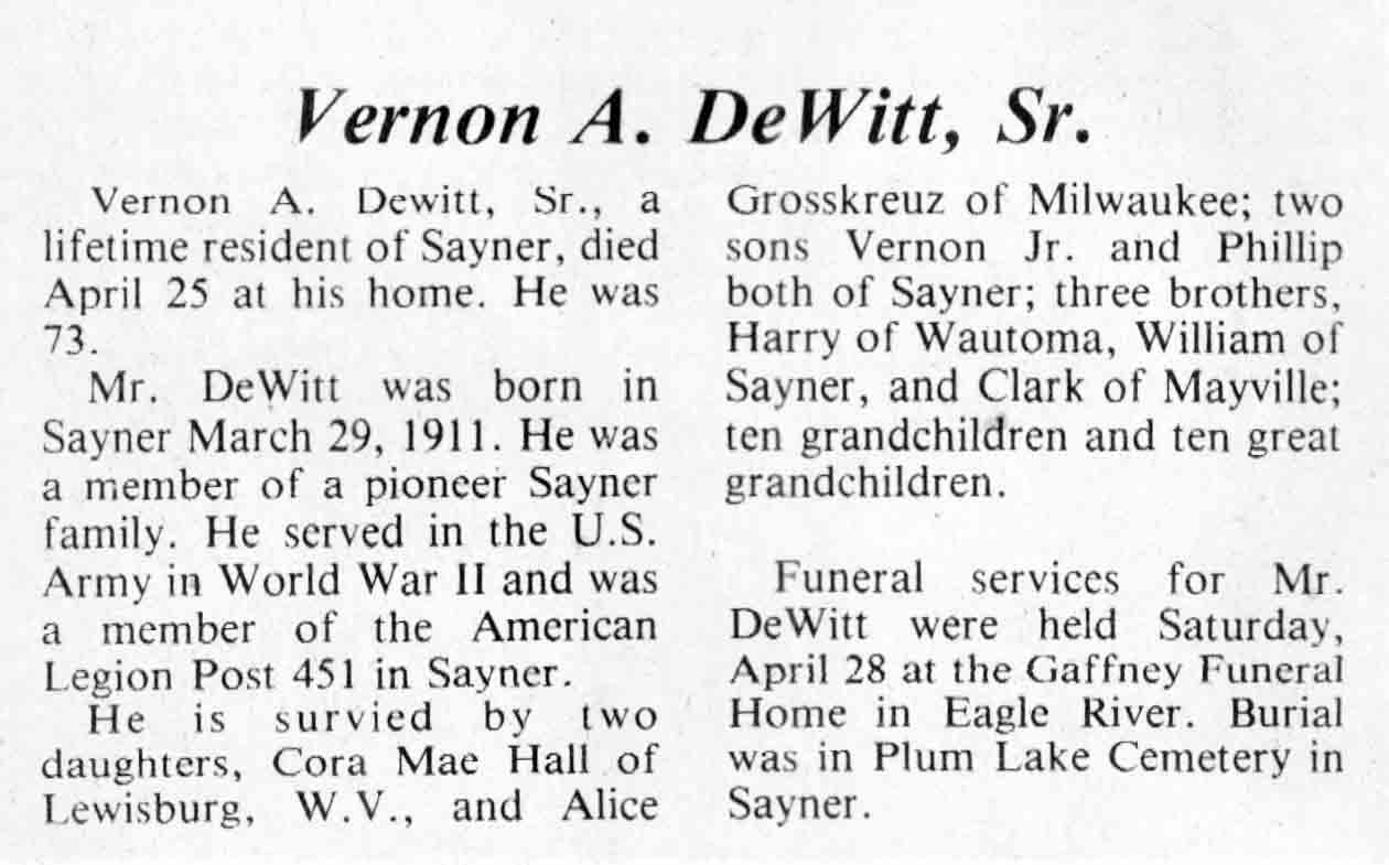 | DeWitt | Vernon A, Sr | 29 Mar 1911 | 25 Apr 1984 | TLN | 02 May 1984 | 6 |