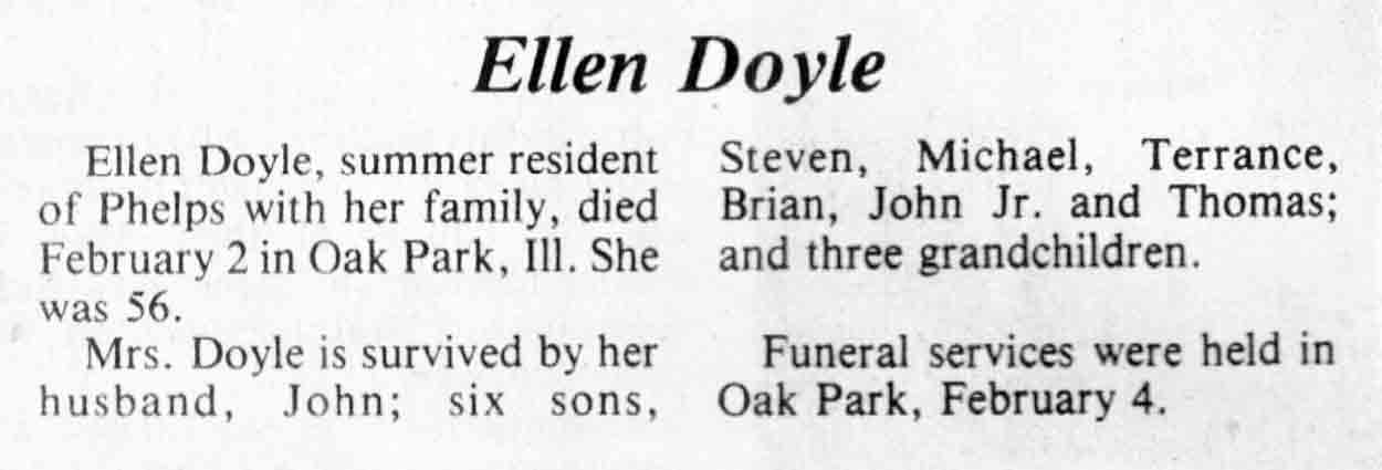 | Doyle | Ellen | c 1928 | 02 Feb 1984 | TLN | 08 Feb 1984 | 4 |