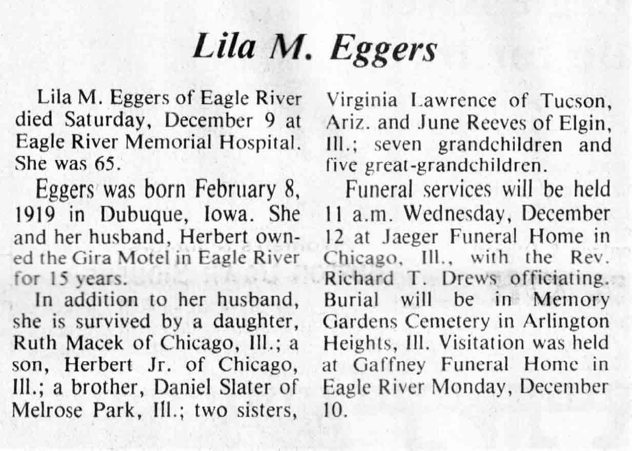 | Eggers | Lila M (Slater) | 08 Feb 1919 | 09 Dec 1984 | TLN | 12 Dec 1984 | 4 |