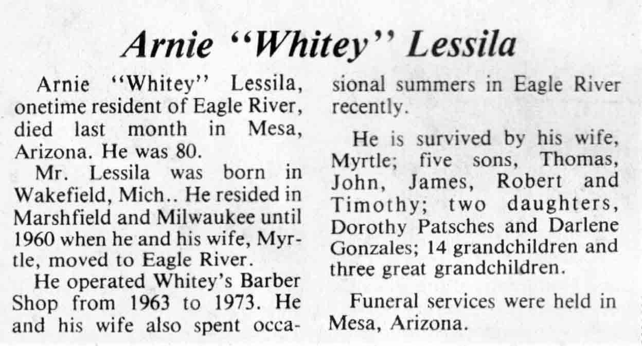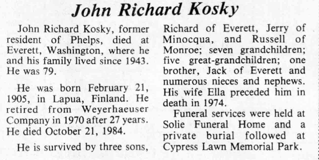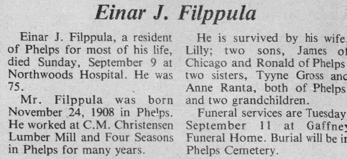 | Filppula | Einar J | 24 Nov 1908 | 09 Sep 1984 | TLN | 12 Sep 1984 | 4 |