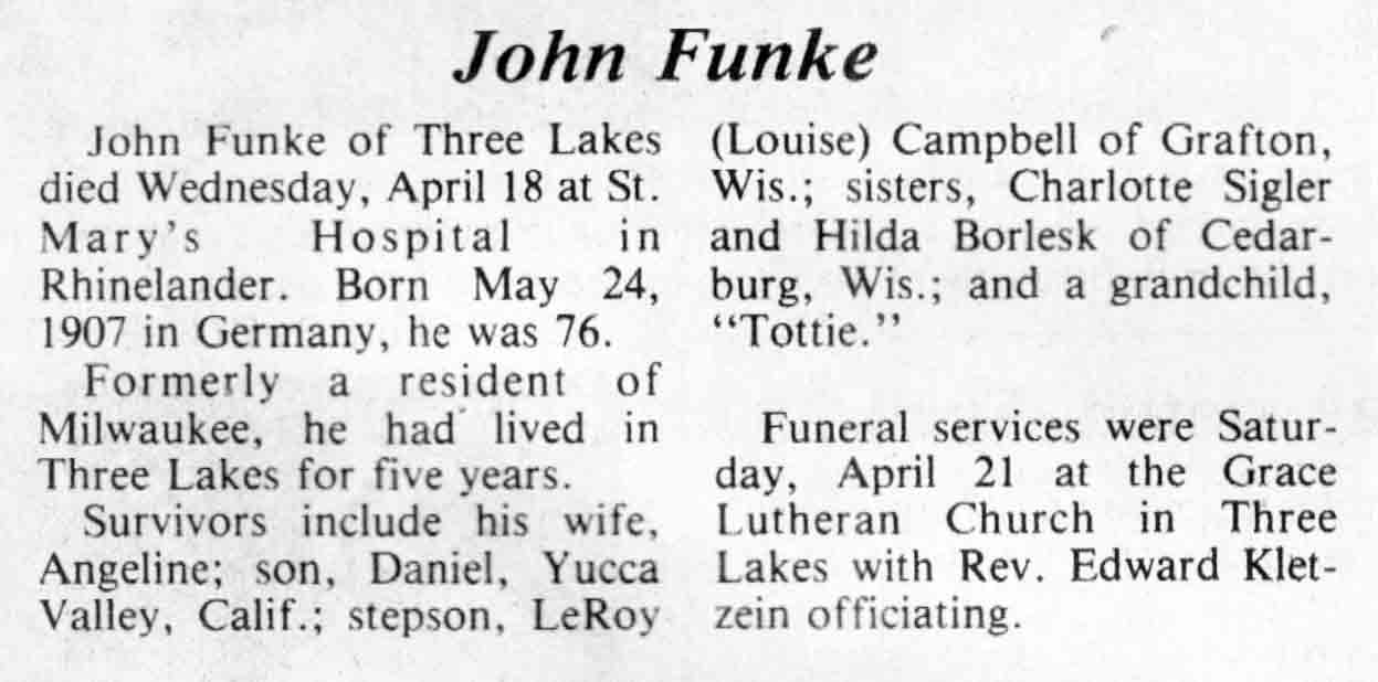 | Funke | John F | 24 May 1907 | 18 Apr 1984 | TLN | 25 Apr 1984 | 4 |
