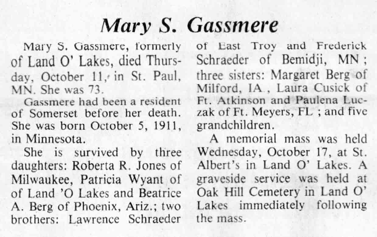 | Gassmere | Mary S (Schraeder) | 05 Oct 1911 | 11 Oct 1984 | TLN | 24 Oct 1984 | 4 |