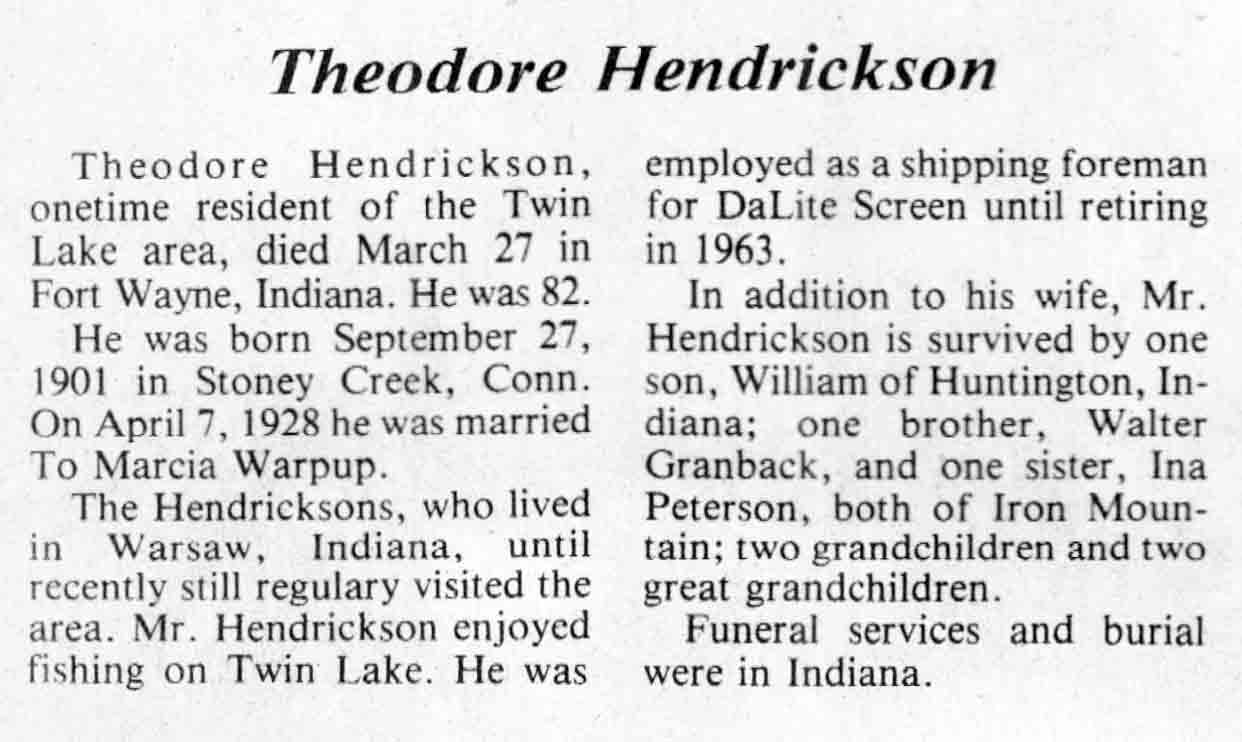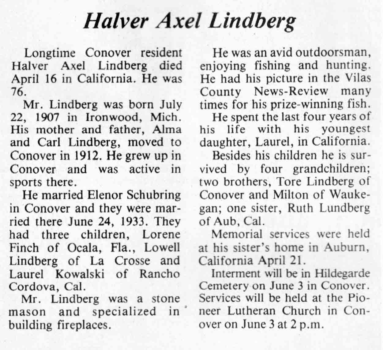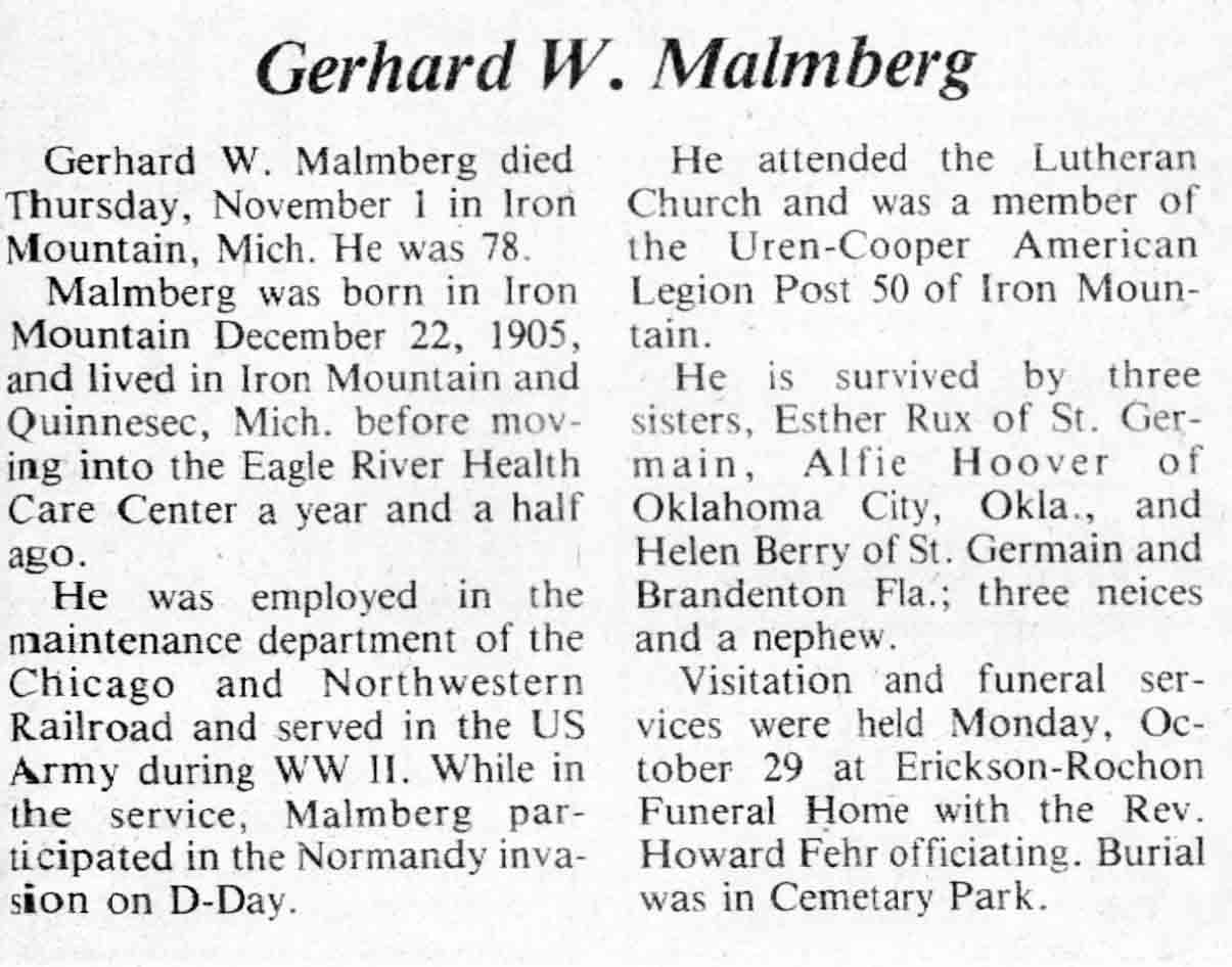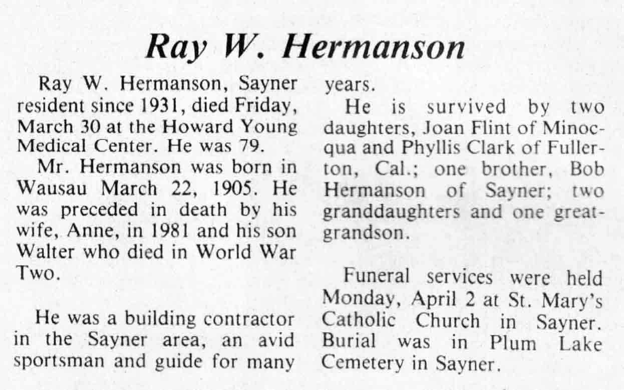 | Hermanson | Ray W | 22 Mar 1905 | 30 Mar 1984 | TLN | 04 Apr 1984 | 4 |