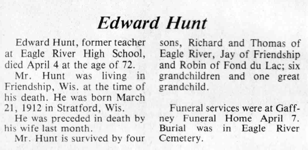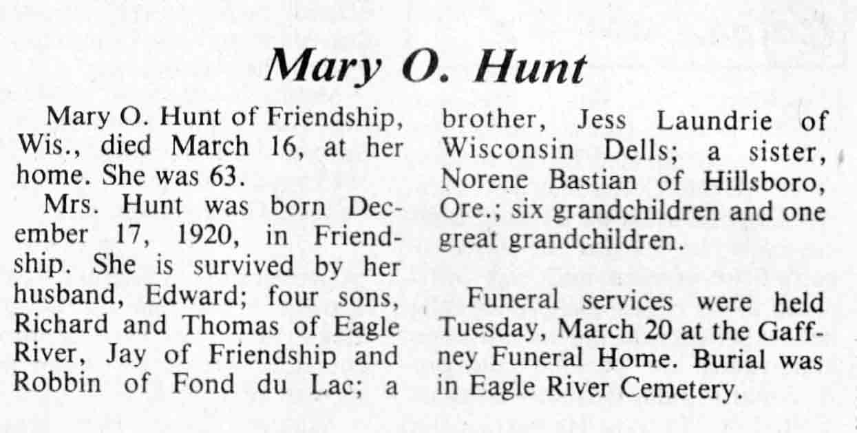 | Hunt | Mary O (Laundrie) | 17 Dec 1920 | 16 Mar 1984 | TLN | 21 Mar 1984 | 22 |