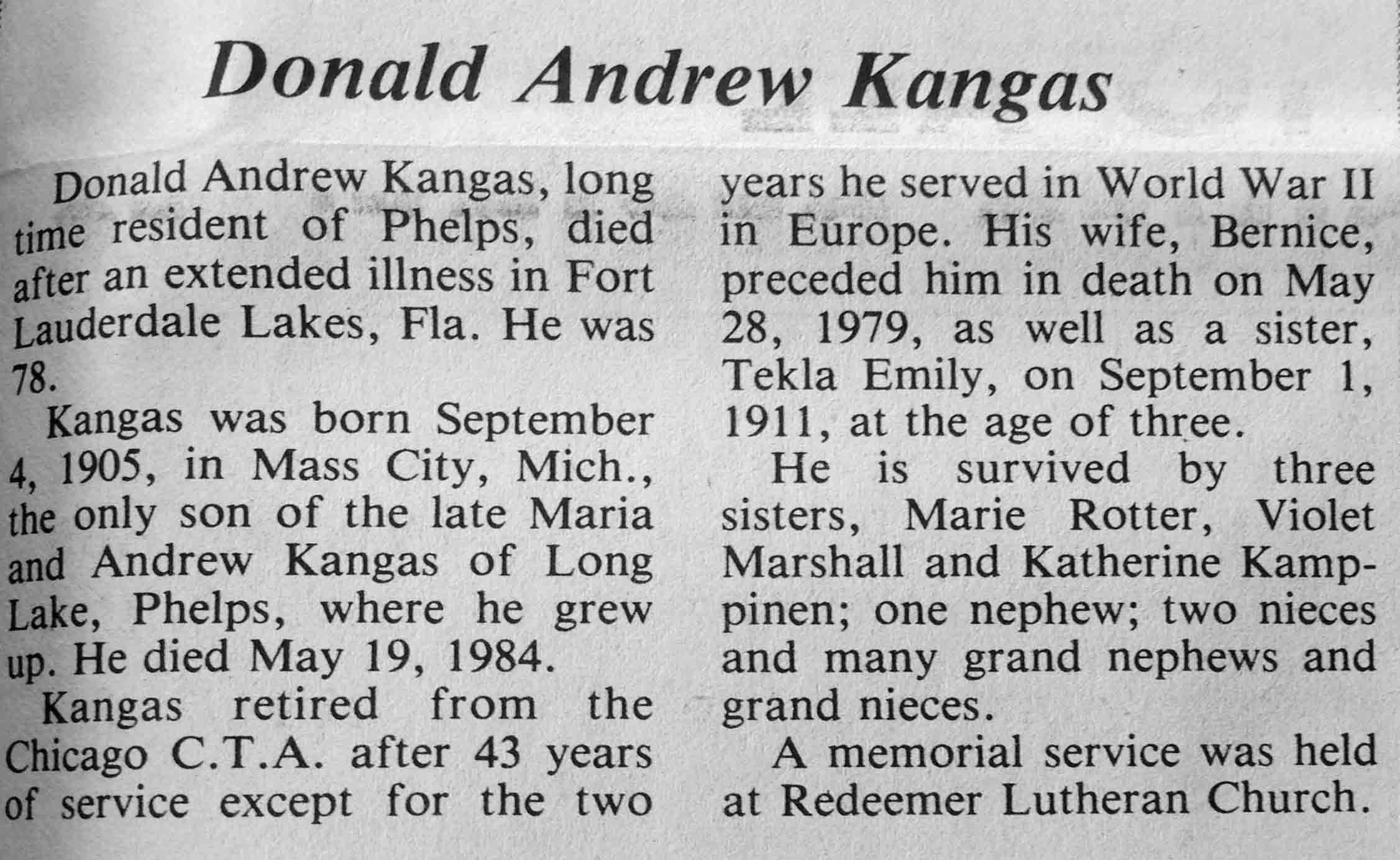 | Kangas | Donald Andrew | 04 Sep 1905 | 19 May 1984 | V N-R | 23 Jan 1985 | 7 |