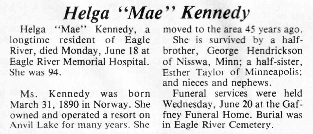 | Kennedy | Helga 'Mae' | 31 Mar 1890 | 18 Jun 1984 | TLN | 27 Jun 1984 | 4 |