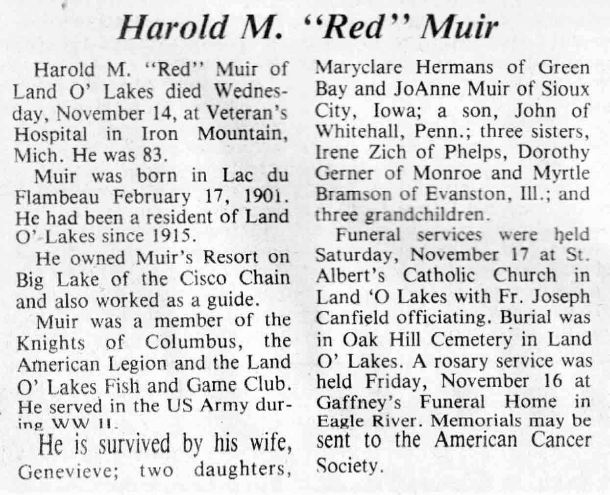 | Muir | Harold M 'Red' | 17 Feb 1901 | 14 Nov 1984 | TLN | 21 Nov 1984 | 4 |