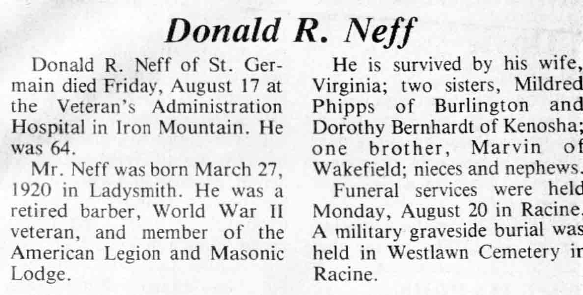 | Neff | Donald R | 27 Mar 1920 | 17 Aug 1984 | TLN | 22 Aug 1984 | 4 |