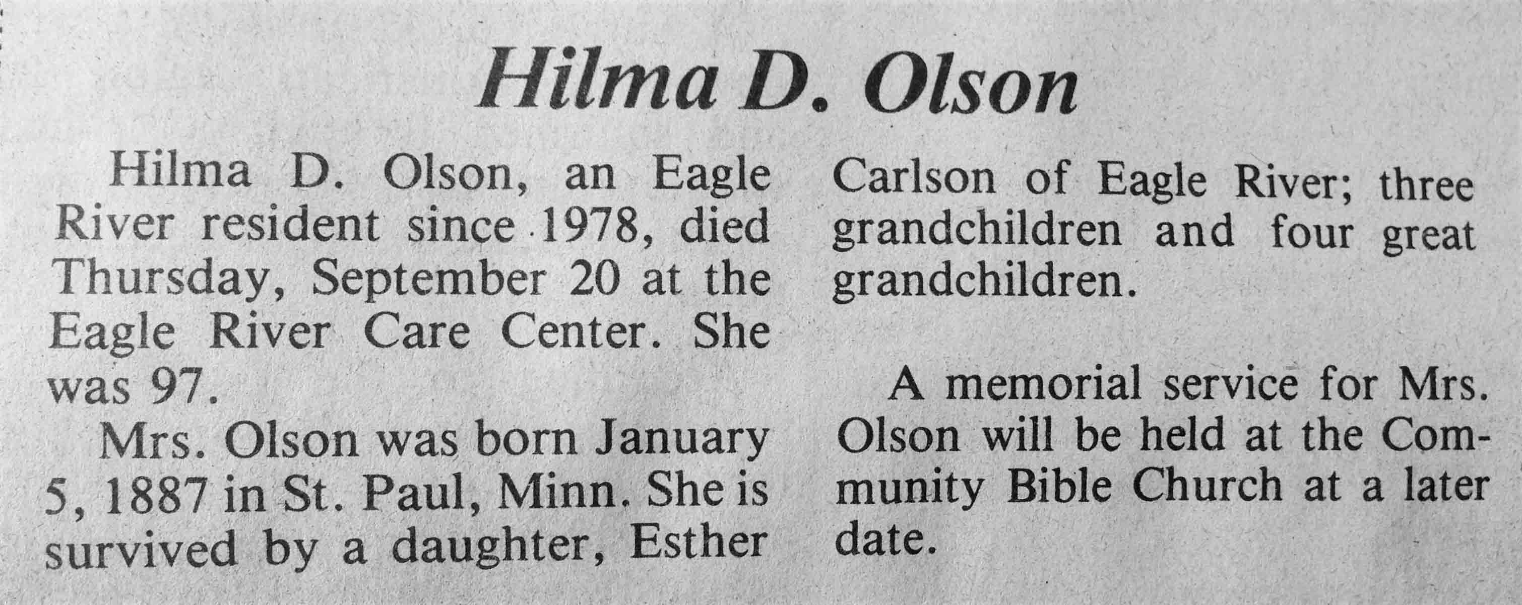 | Olson | Hilma D | 5 Jan 1887 | 20 Sep 1984 | TLN | 26 Sep 1984 | 4 |