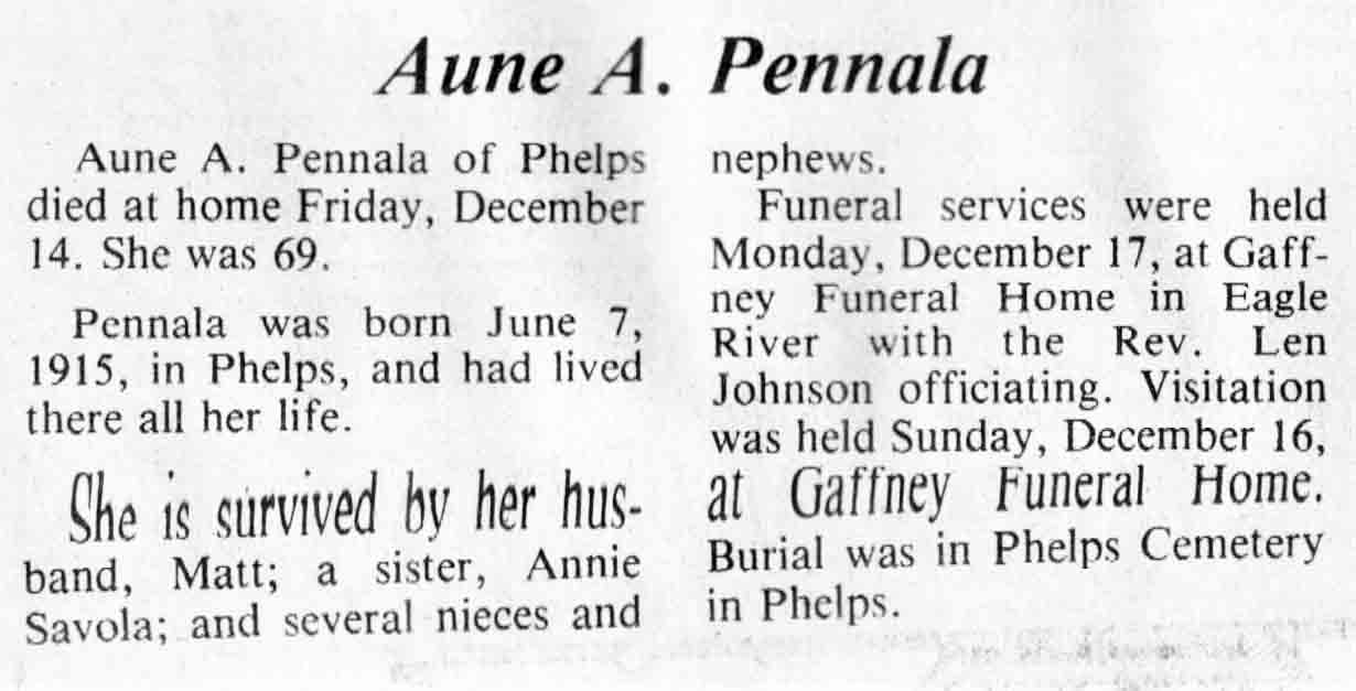 | Pennala | Aune A | 07 Jun 1915 | 14 Dec 1984 | TLN | 19 Dec 1984 | 4 |