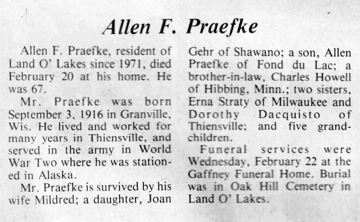 | Praefke | Allen F | 03 Sep 1916 | 20 Feb 1984 | TLN | 29 Feb 1984 | 4 |