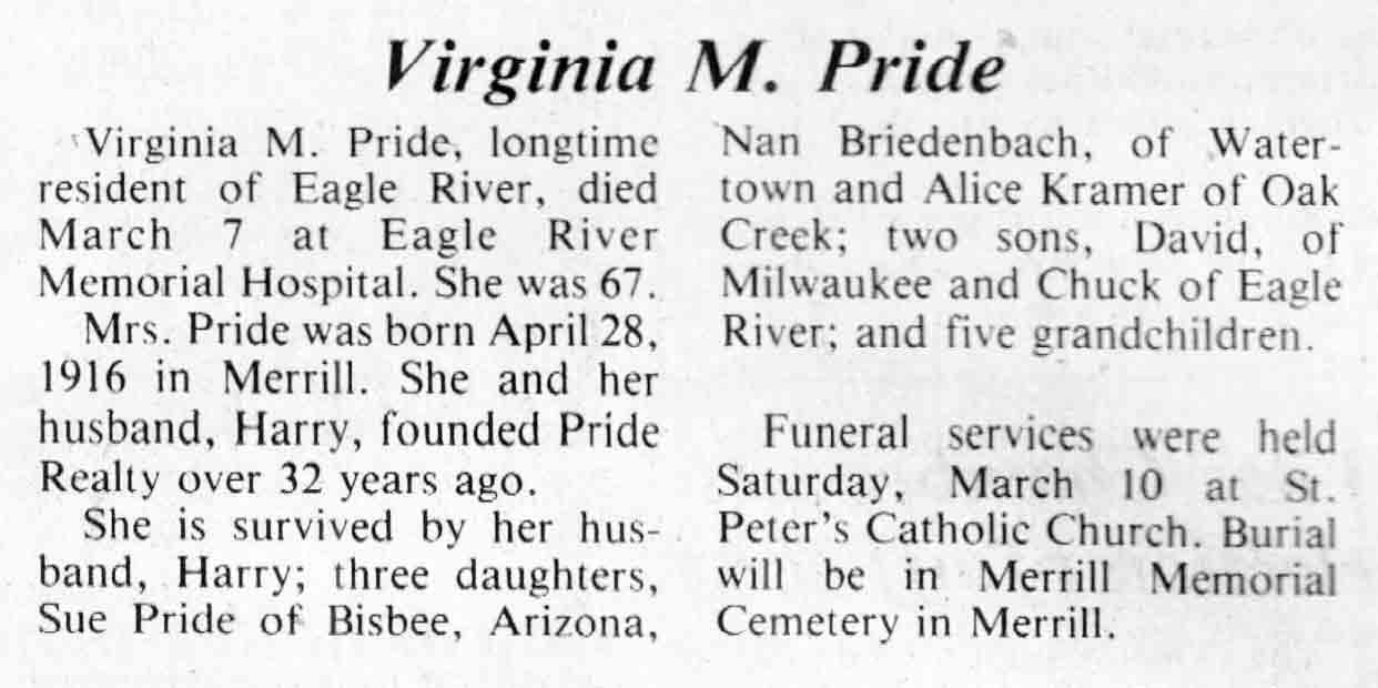 | Pride | Virginia M | 28 Apr 1916 | 07 Mar 1984 | TLN | 14 Mar 1984 | 4 |
