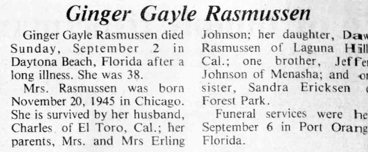 | Rasmussen | Ginger Gayle (Johnson) | 20 Nov 1945 | 02 Sep 1984 | TLN | 12 Sep 1984 | 4 |