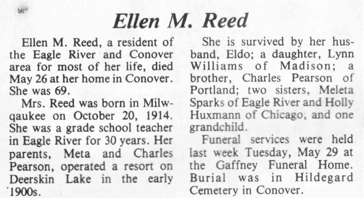 | Reed | Ellen M (Pearson) | 20 Oct 1914 | 26 May 1984 | TLN | 06 Jun 1984 | 4 |