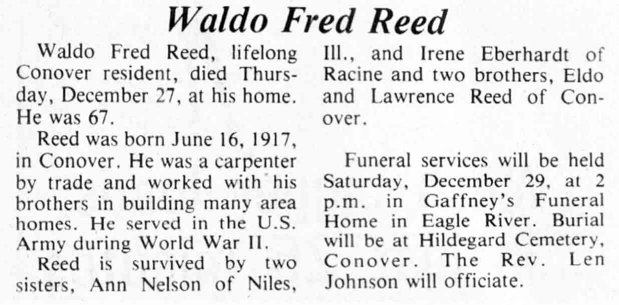 | Reed | Waldo Fred | 16 Jun 1917 | 27 Dec 1984 | V N-R | 02 Jan 1985 | 20 |