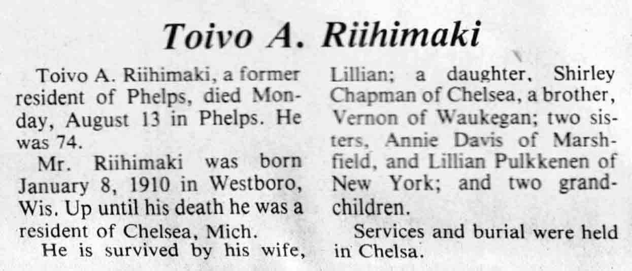 | Riihimaki | Toivo A | 08 Jan 1910 | 13 Aug 1984 | TLN | 15 Aug 1984 | 4 |