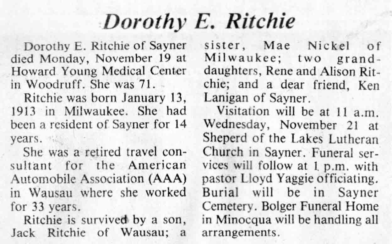 | Ritchie | Dorothy E | 13 Jan 1913 | 19 Nov 1984 | TLN | 21 Nov 1984 | 4 |
