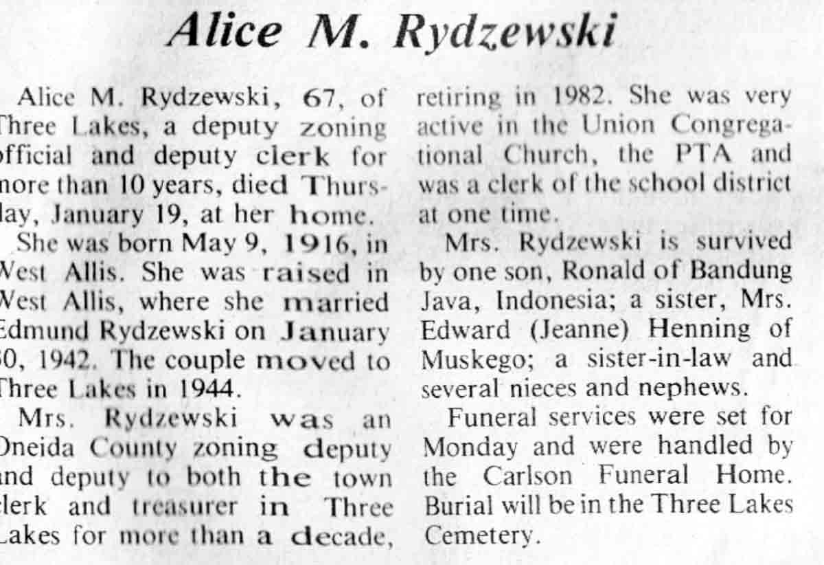 | Rydzewski | Alice M | 09 May 1916 | 19 Jan 1984 | TLN | 25 Jan 1984 | 7 |