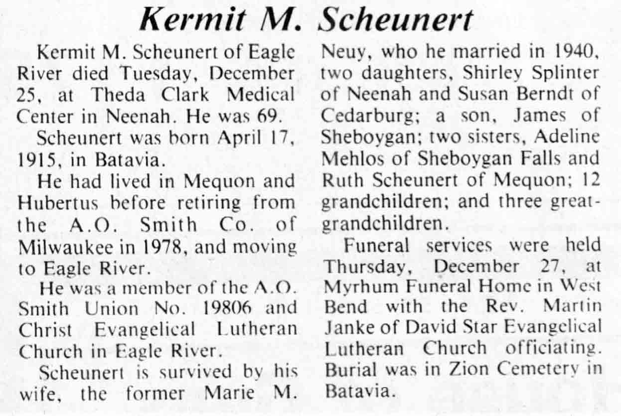 | Scheunert | Kermit M | 17 Apr 1915 | 25 Dec 1984 | V N-R | 02 Jan 1985 | 20 |