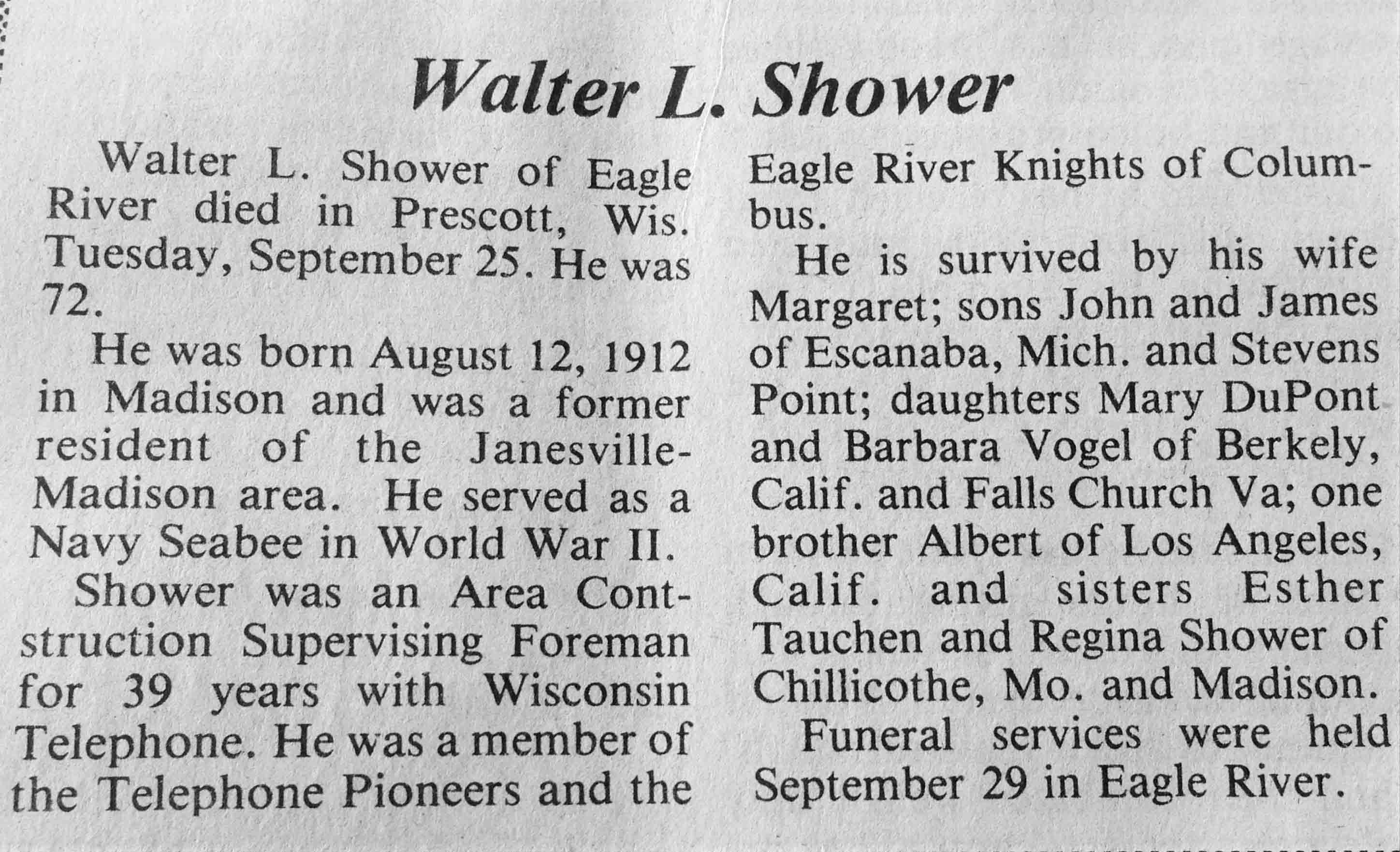 | Shower | Walter L | 12 Aug 1912 | 25 Sep 1984 | TLN | 03 Oct 1984 | 4 |