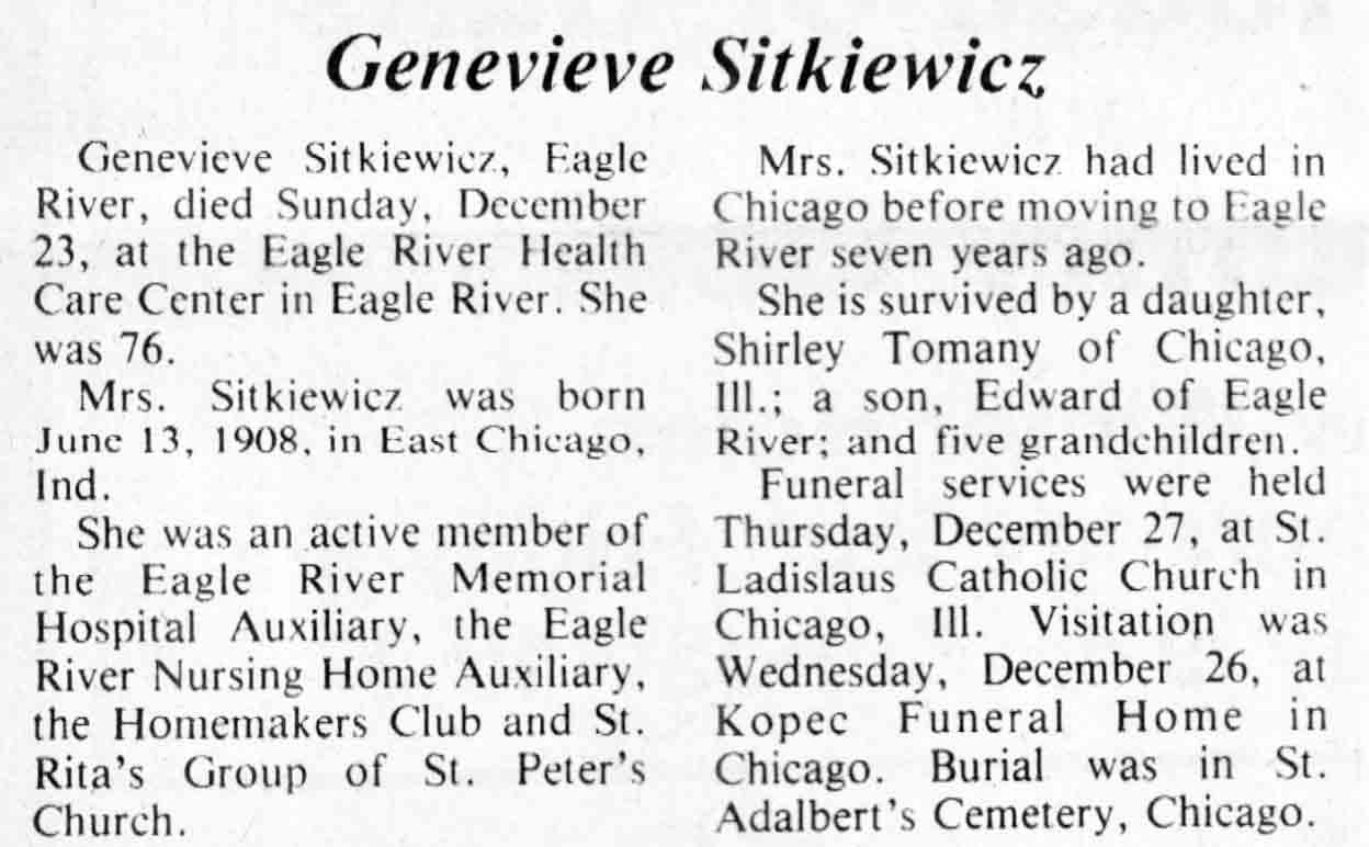| Sitkiewicz | Genevieve | 13 Jun 1908 | 23 Dec 1984 | V N-R | 02 Jan 1985 | 20 |