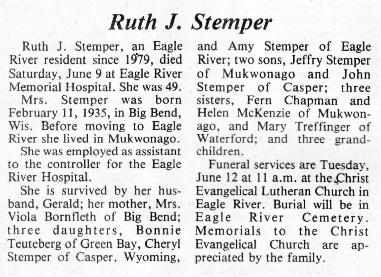 | Stemper | Ruth J (Bornfleth) | 11 Feb 1935 | 09 Jun 1984 | TLN | 13 Jun 1984 | 4 |