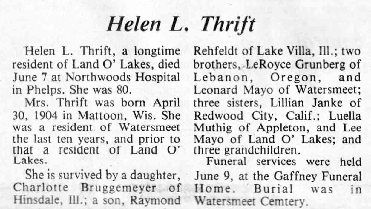 | Thrift | Helen L | 30 Apr 1904 | 07 Jun 1984 | TLN | 13 Jun 1984 | 4 |