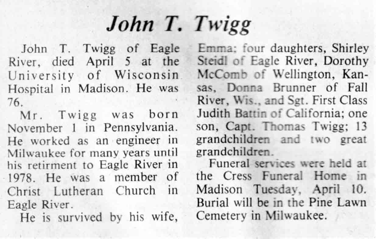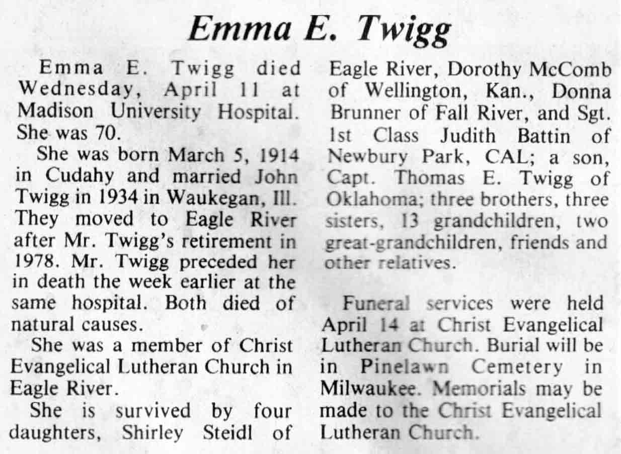 | Twigg | Emma E | 05 Mar 1914 | 11 Apr 1984 | TLN | 18 Apr 1984 | 4 |