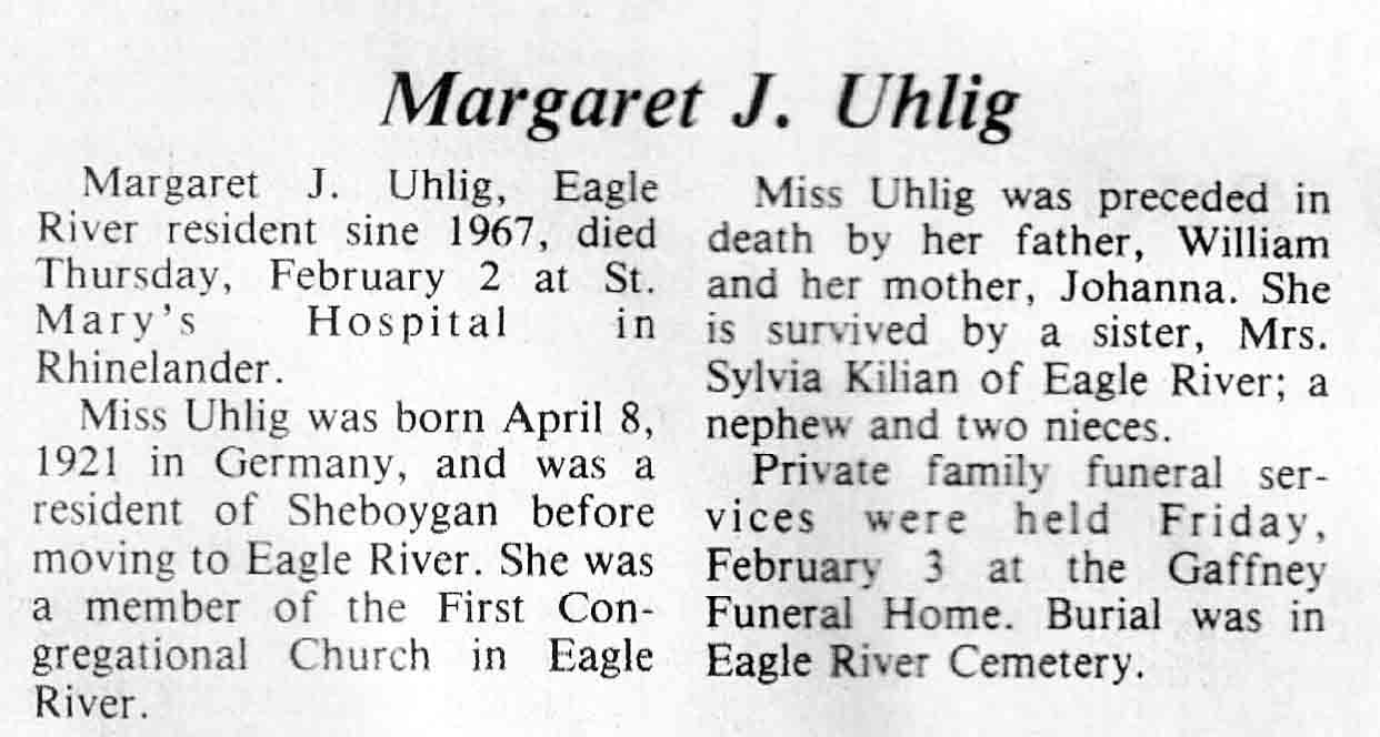 | Uhlig | Margaret J | 08 Apr 1921 | 02 Feb 1984 | TLN | 08 Feb 1984 | 4 |
