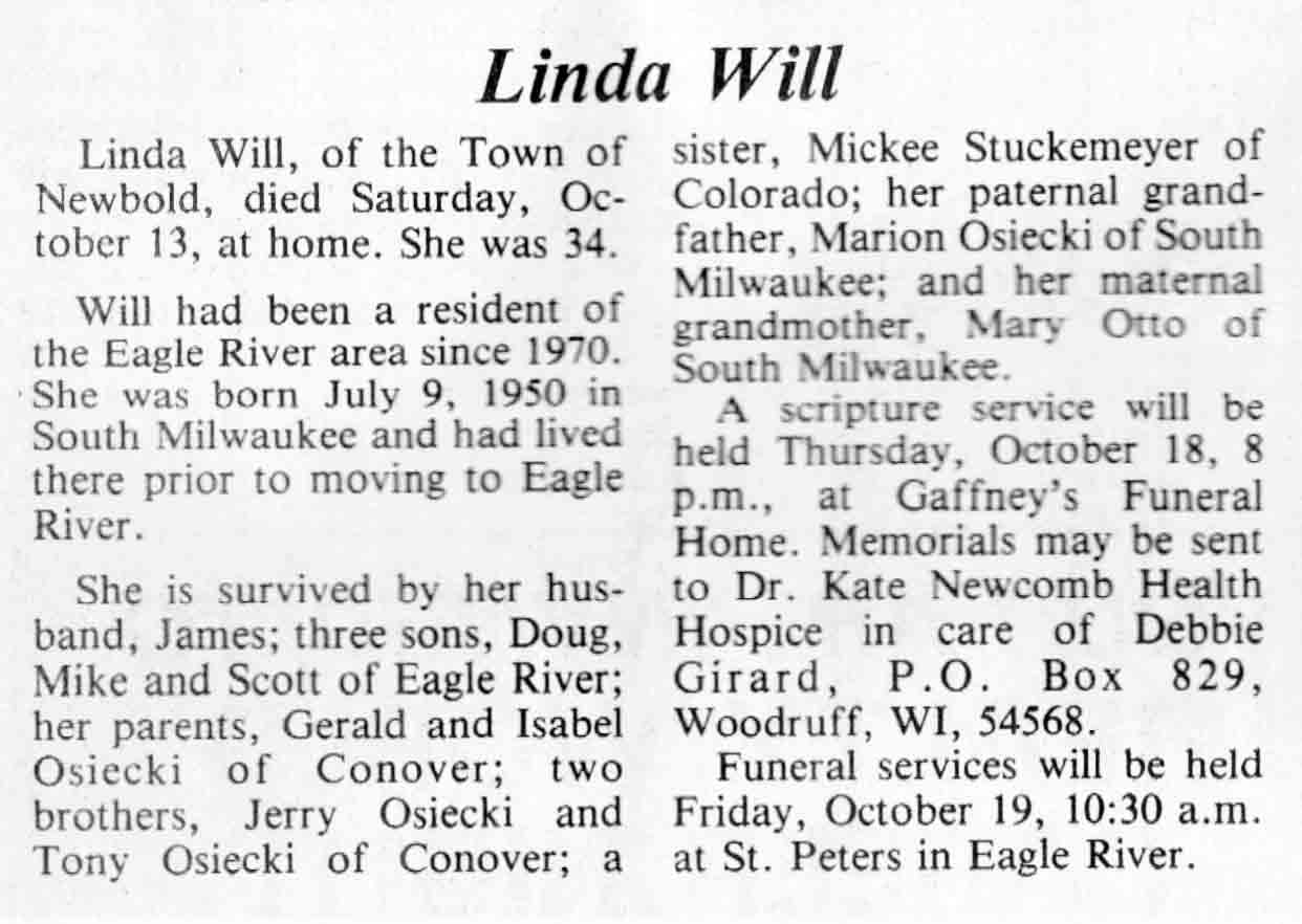 | Will | Linda (Osiecki) | 09 Jul 1950 | 13 Oct 1984 | TLN | 17 Oct 1984 | 4 |