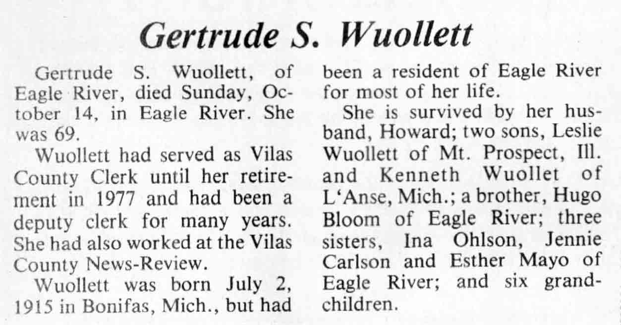 | Wuollett | Gertrude S (Bloom) | 02 Jul 1915 | 14 Oct 1984 | TLN | 17 Oct 1984 | 4 |