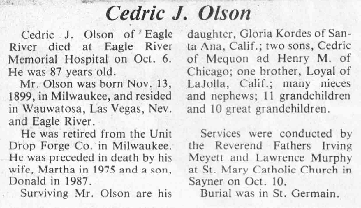 | Olson | Cedric J #2 | 13 Nov 1899 | 06 Oct 1987 | V N-R | 21 Oct 1987 | 4 |