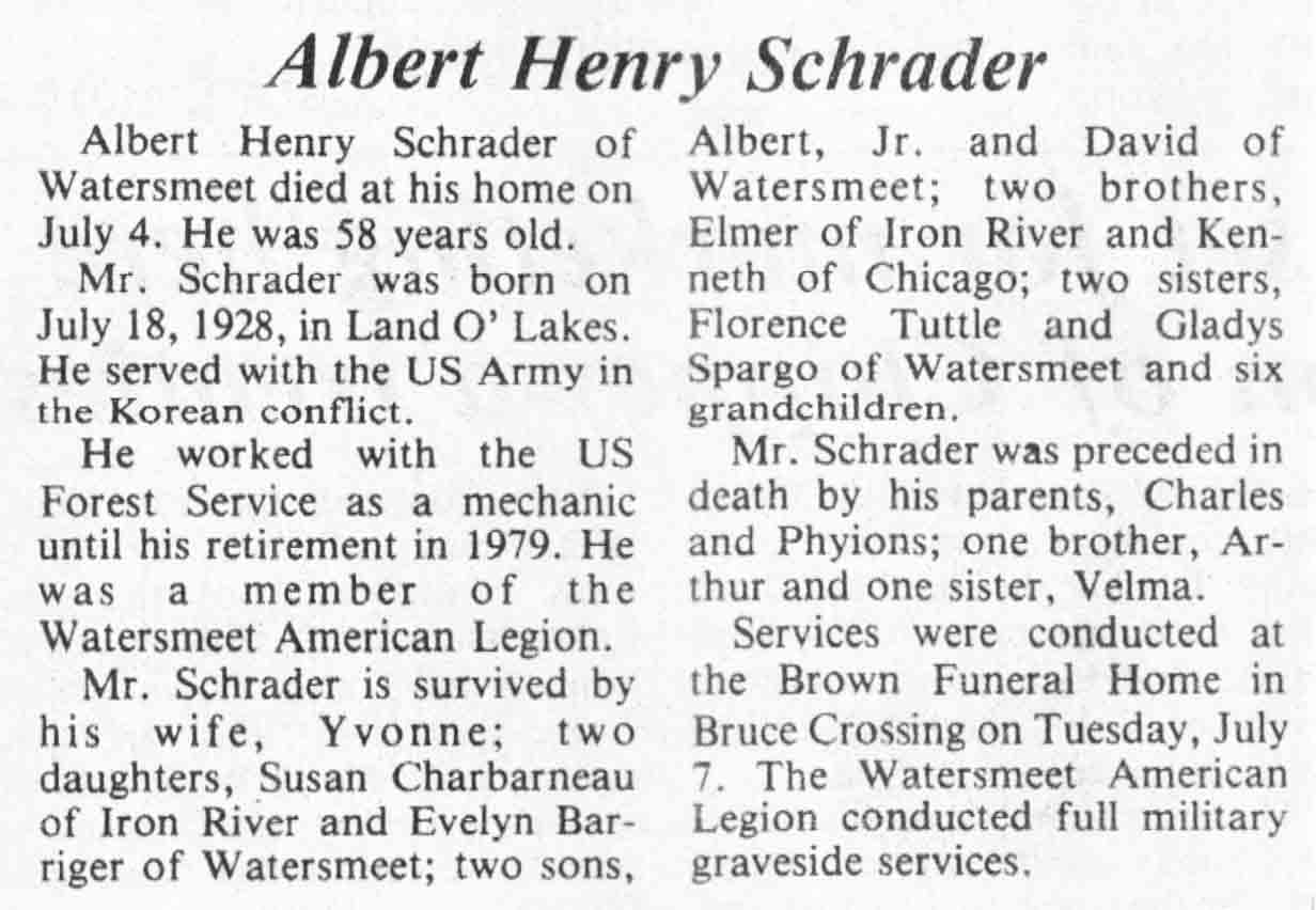 | Schrader | Albert Henry | 18 Jul 1928 | 04 Jul 1987 | V N-R | 08 Jul 1987 | 4 |